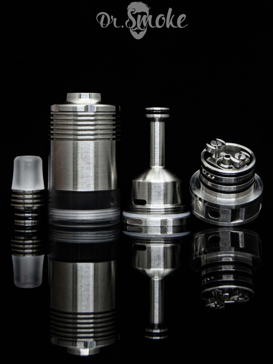 Как и все девайсы серии, новинка отличается гибкой системой регулировки обдува. Снаружи устройства есть вращающееся кольцо AFC со стопором на резьбе, но, в отличие от предыдущих версий, с одним внешним отверстием для забора воздуха. Для настройки интенсивности тяги предлагается совмещать это самое отверстие на кольце с группой каналов под ним, размеры которых – 1.2мм, 1.7мм и 2*2.3мм. Никуда не делась и возможность менять воздуховоды непосредственно под спиралью, в данном случае без необходимости снимать намотку. Новые сменные жиклеры теперь совмещены с плюсовым пином и вкручиваются снизу, а всего таких воздуховодов в комплекте три: 1.2мм, 1.4мм, 1.7мм. Что касается базы, то она все так же снабжена фрезерованными стойками под одну спираль и двумя ванночками для укладки хлопка.