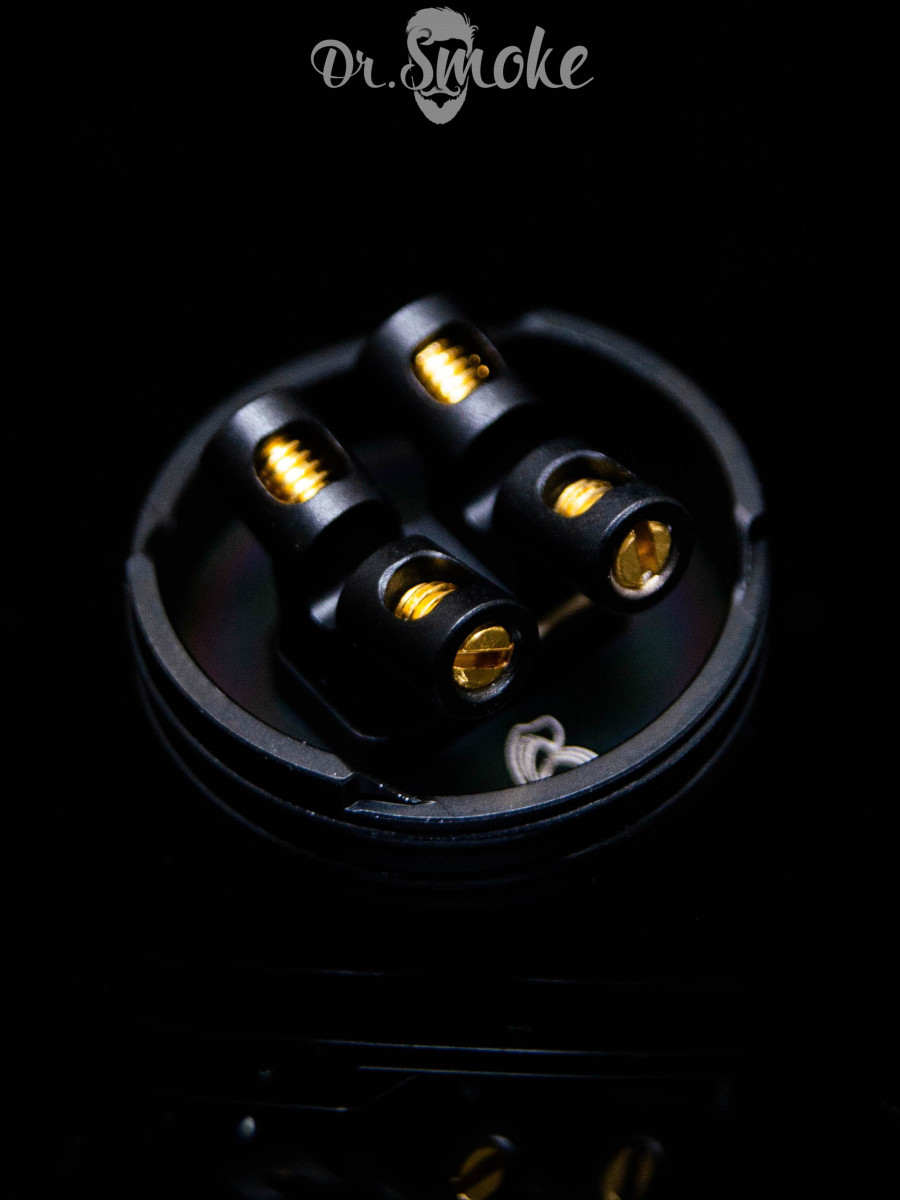 В центре находится дека, куда мы будем устанавливать спирали, она матово-черная с золотыми винтами. На самом деле место монтажа выглядит реально эффектно и красиво. Стоит сказать, что установка спиралей может показаться немного сложнее, чем на Hellvape Pro, например.