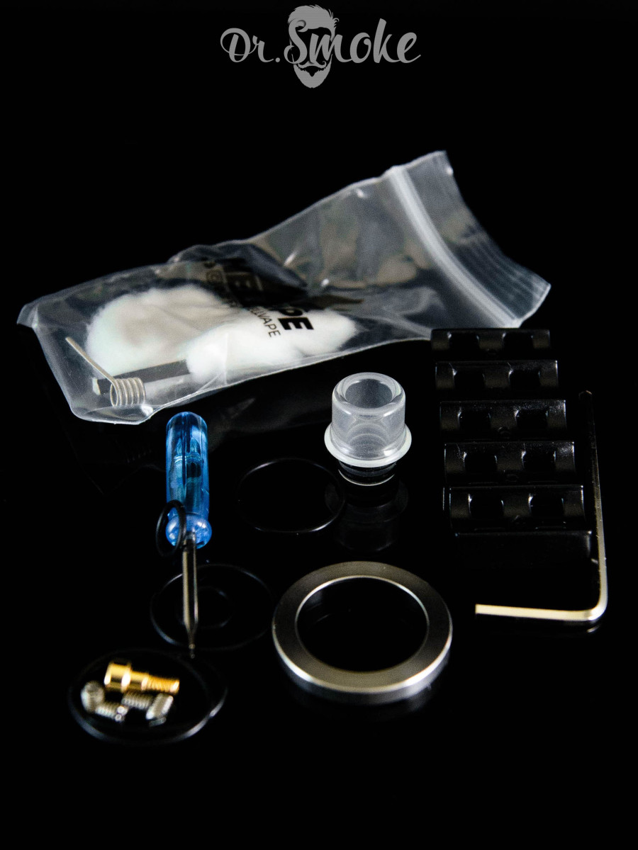 После установки практически незаметно, что оно не является частью RDA, так как цвет идеально совпадает. Над Mini находится коробка со всеми аксессуарами, включая направляющую для обрезки спирали, пин для нижней подачи жидкости, отвертку, шестигранный ключ, одну спираль NI80 на 0,45 Ом, одну нить для хлопка, запасные уплотнительные кольца и запасные винты. Под коробкой и поролоновой вставкой находится руководство пользователя.