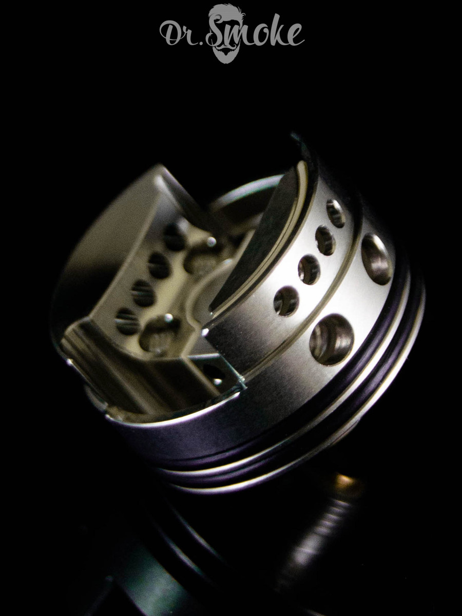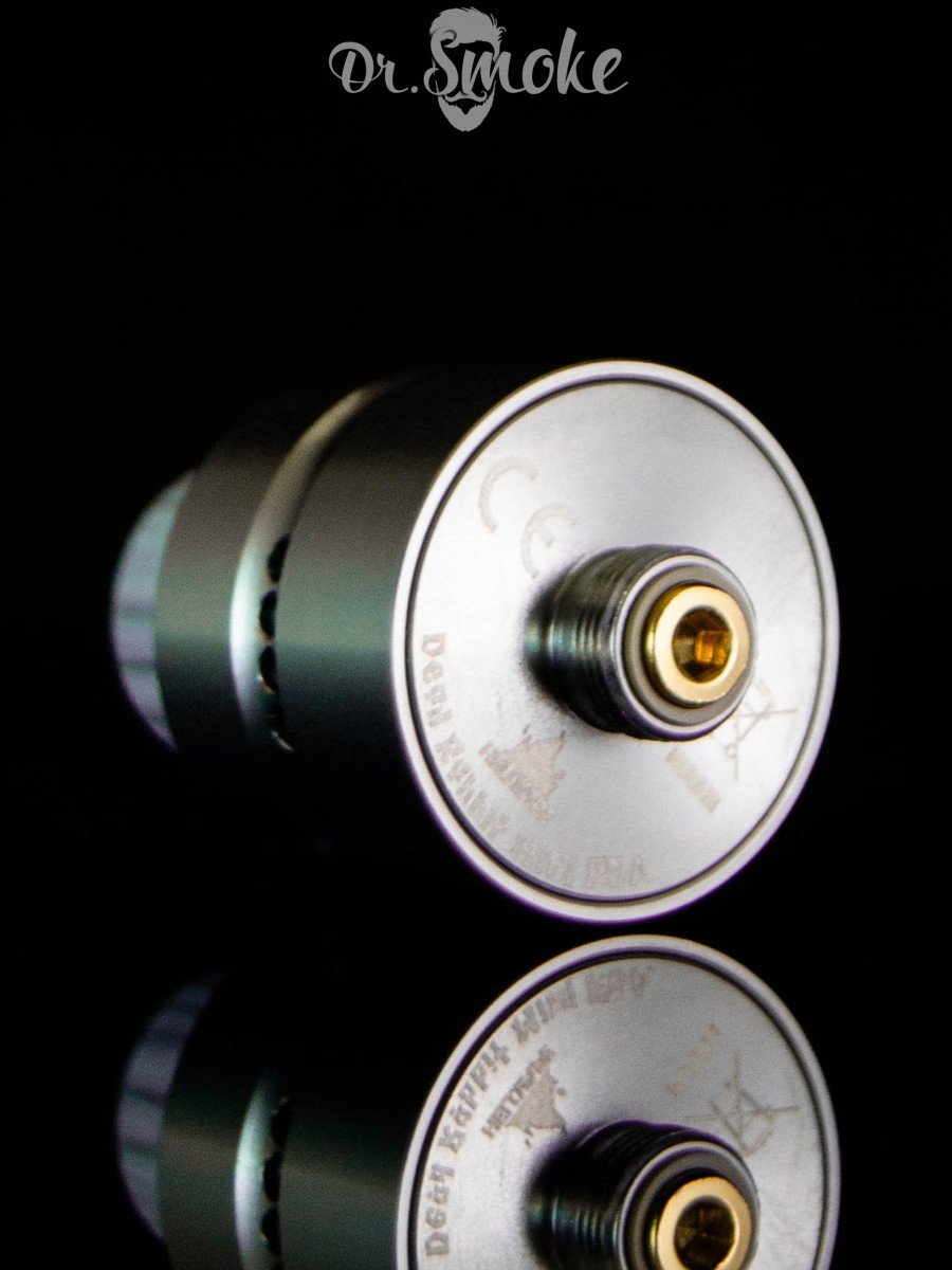 Dead Rabbit Mini имеет бесстоечную базу для установки одной спирали и четыре отверстия для обдува в стиле MTL. Это небольшая дрипка, как следует из названия, диаметром всего 20 мм, но в комплекте идет 22-миллиметровое декоративное кольцо, которое улучшает внешний вид при использовании на модах с более крупным основанием.