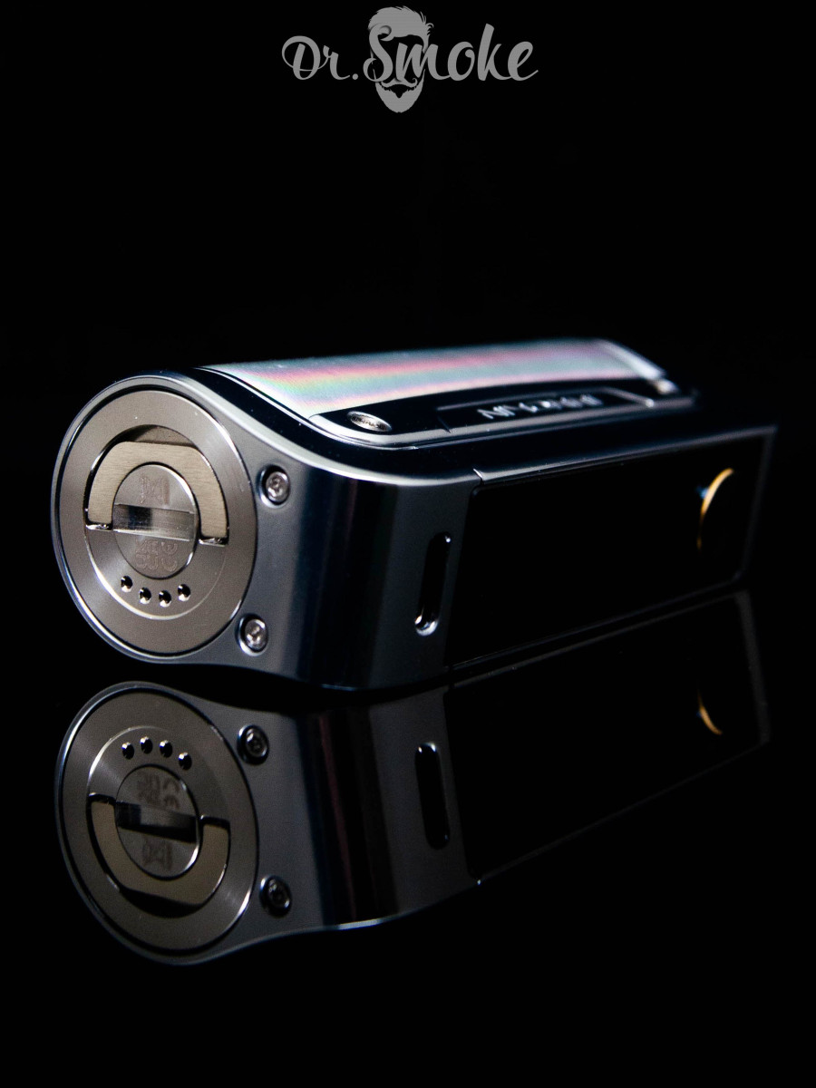 Работает мод от одной батареи 18650, и этого достаточно, чтобы раскрыть заявленные 80 Вт без просадок на старте. Элемент питания устанавливается снизу — через резьбовую крышку с откидным рычагом. Решение не декоративное: рычаг дает нормальный хват, крышка закручивается плотно, без ощущения «на тонкой резьбе».