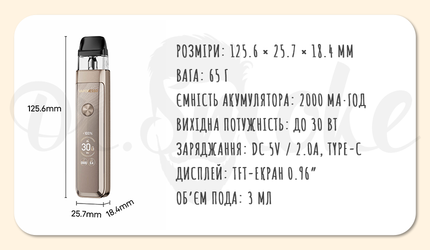 Xros Pro 2 зберігає високий і тонкий силует, знайомий за попередніми моделями лінійки, і водночас перегукується з більшістю вейпів на ринку. З картриджем висота трохи менша за 126 мм, ширина — 26 мм, глибина — близько 18,4 мм, що робить пристрій зручним у руці та в кишені.