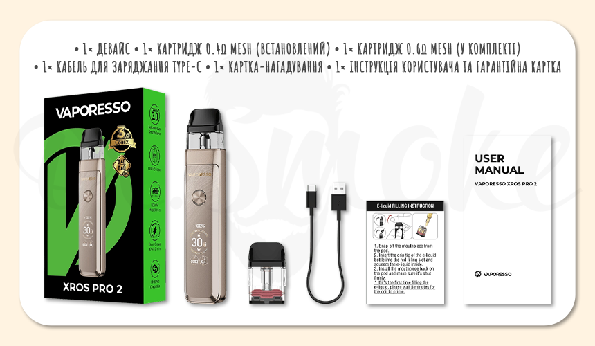 Картриджі Xros Pro 2 вміщують 3 мл рідини (або 2 мл у країнах із TPD) і одразу пропонують два варіанти опору — 0,4 Ом та 0,6 Ом, щоб підлаштуватися під ваш стиль паріння.